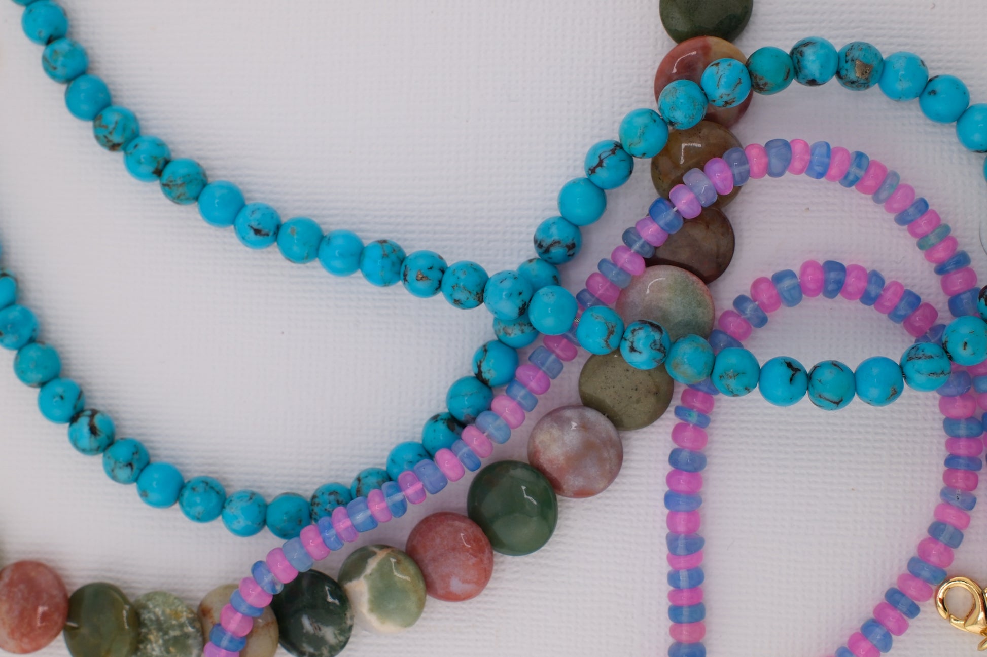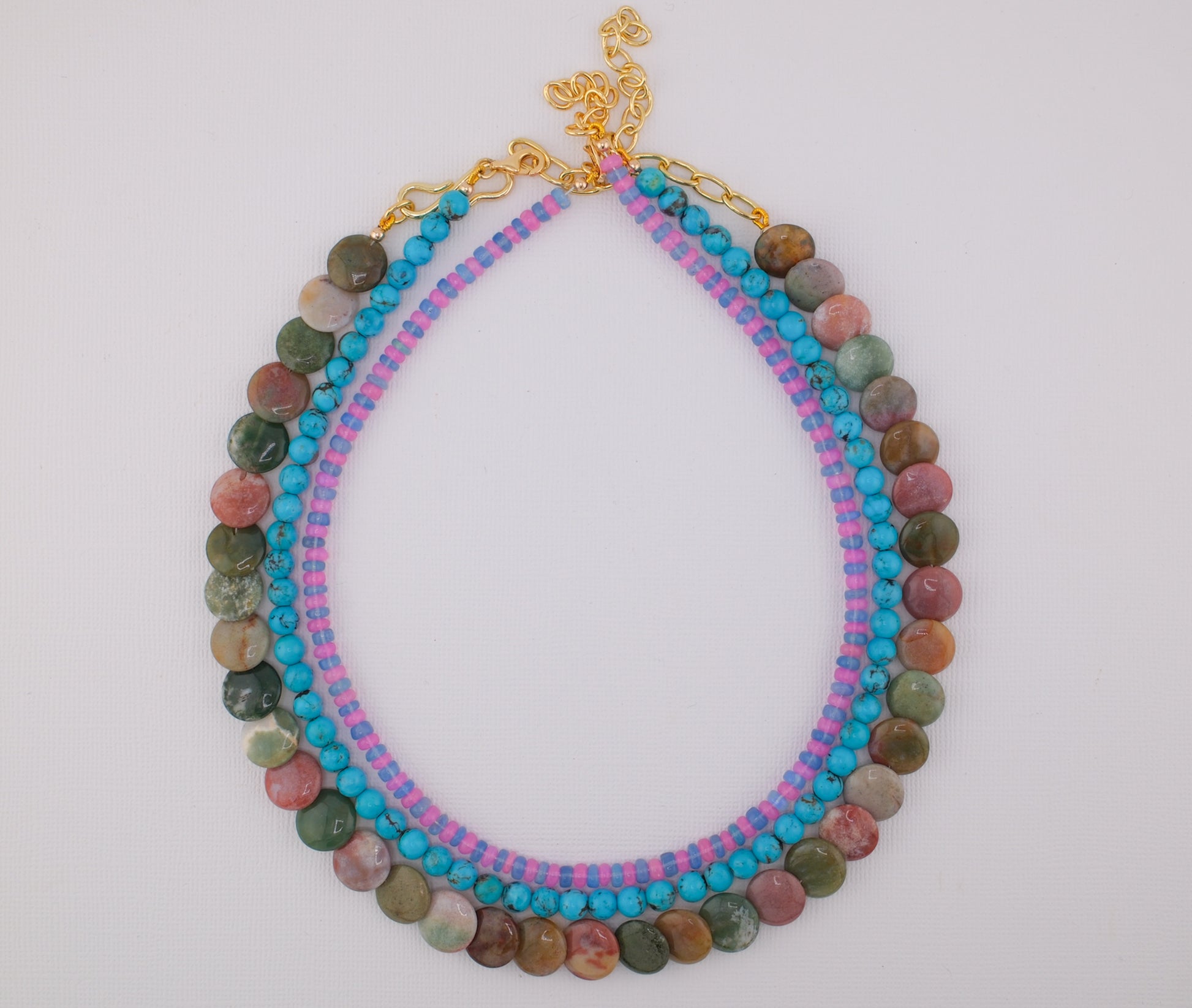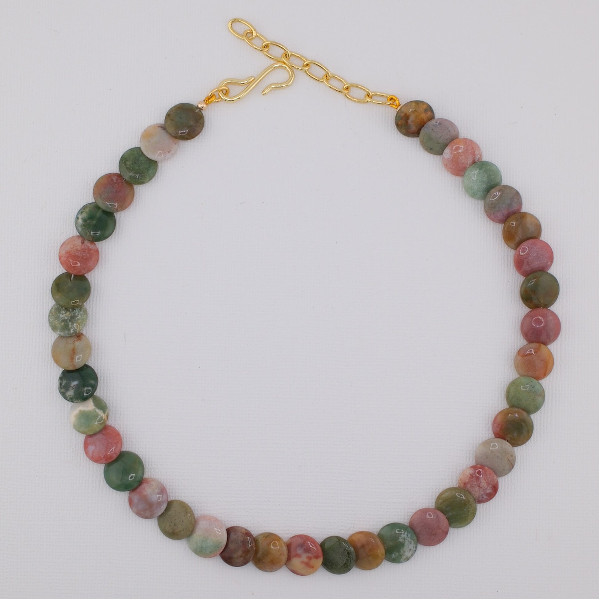 A strand of softly variegated Indian agate creates a natural mosaic of greens, rose tones, and warm earth shades. Finished with gold-plated hardware and an adjustable extender, it adds an effortless touch of color and texture to any everyday stack.