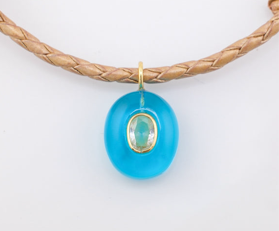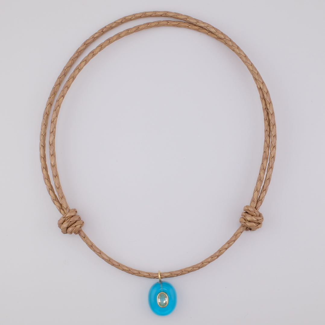 Gold braided leather cord necklace featuring a vibrant blue quartz pendant, accented by a faceted center stone framed in vermeil.