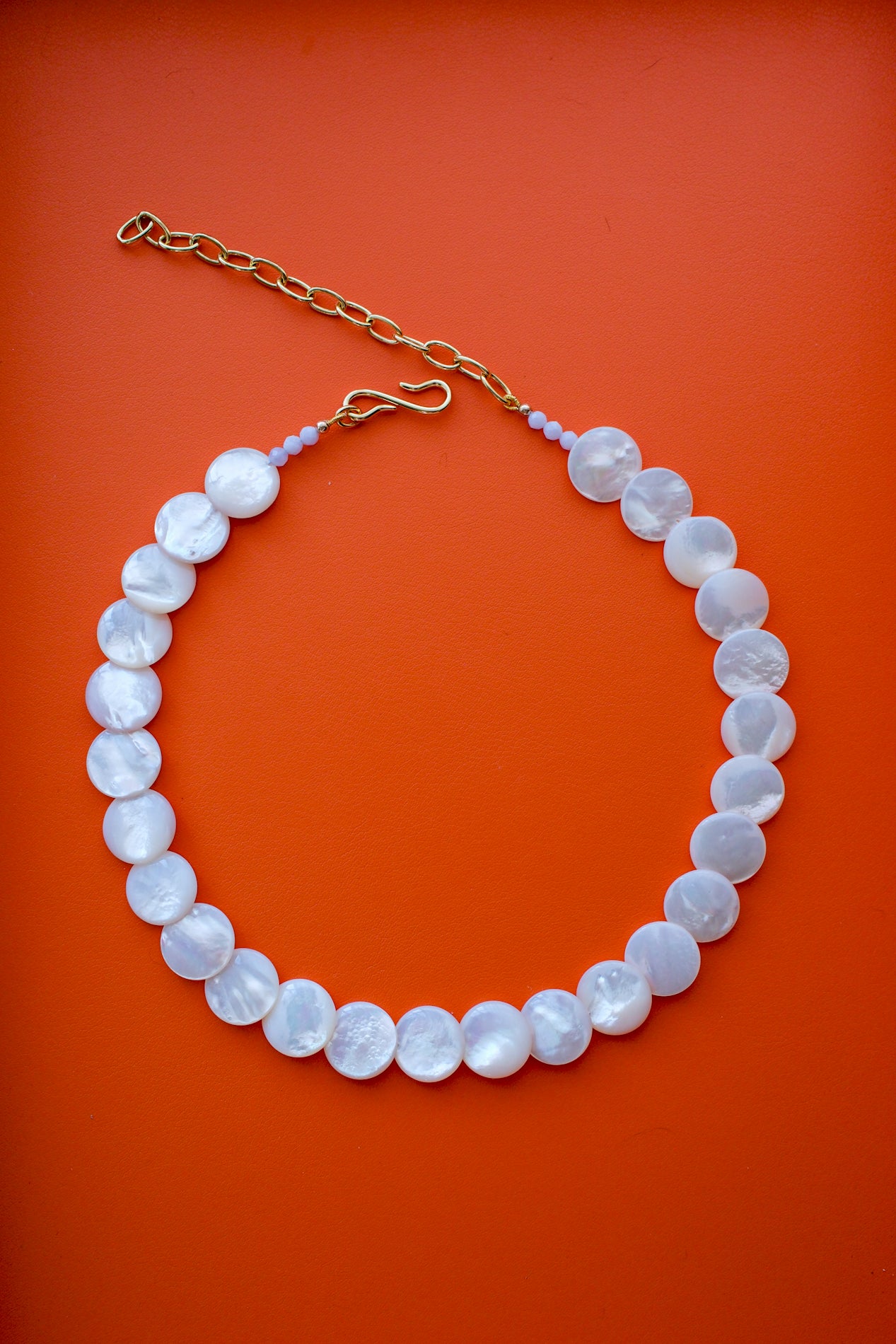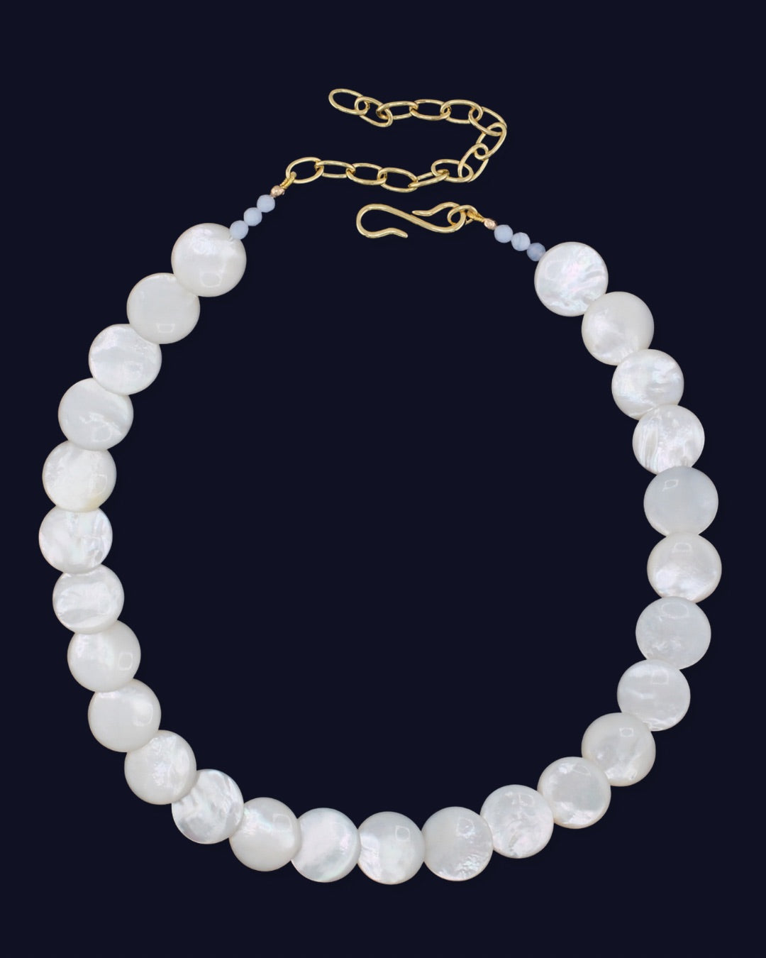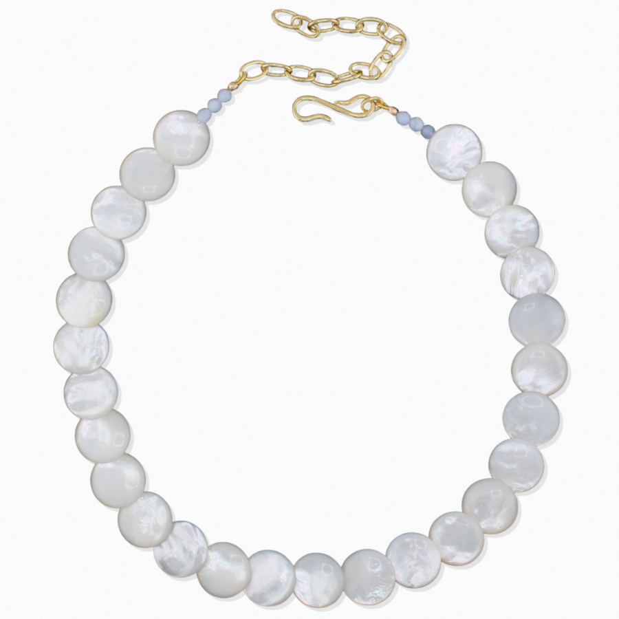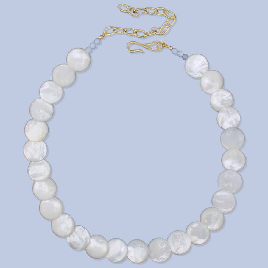 Components: Mother of pearl, blue lace agate accents, gold plated brass