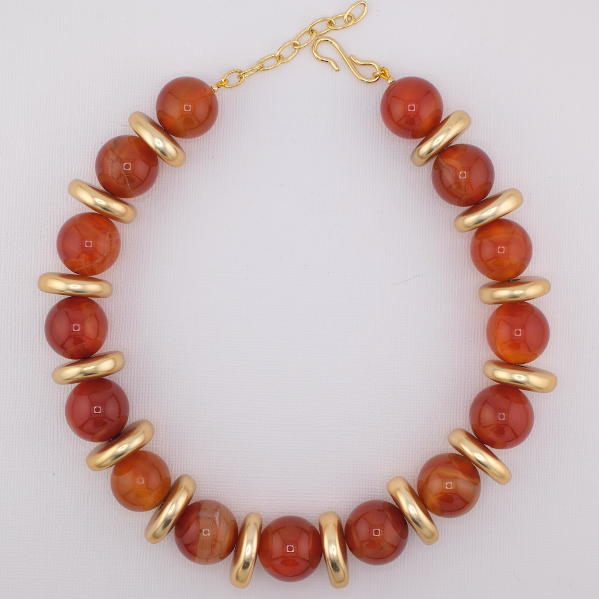 Composition: carnelian, vintage gold painted resin discs, gold plated brass