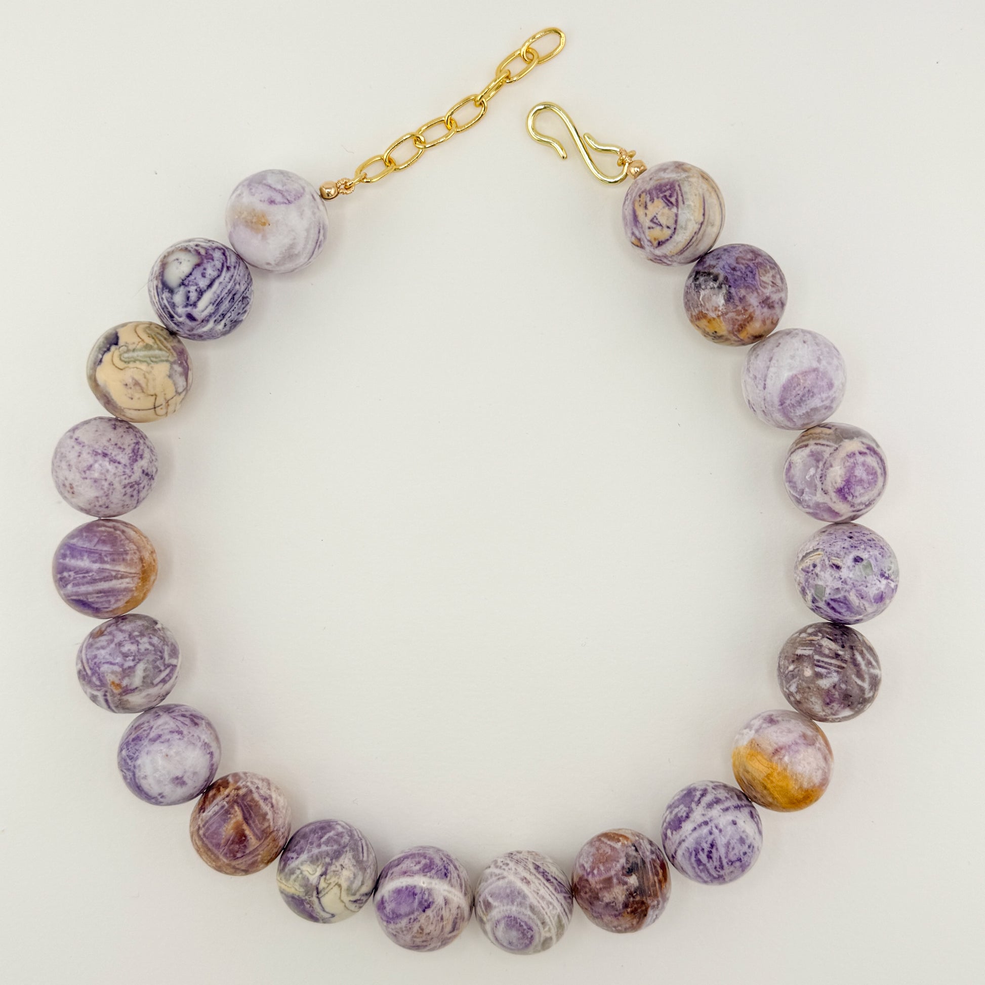 Step into a garden of light with the Wisteria Necklace. This sculptural strand features glossy Tiffany stone in marbled shades of purple, cream, green, and golden honey. Each bead looks like a tiny painted landscape with swirls that evoke sunlight drifting through blooming wisteria.